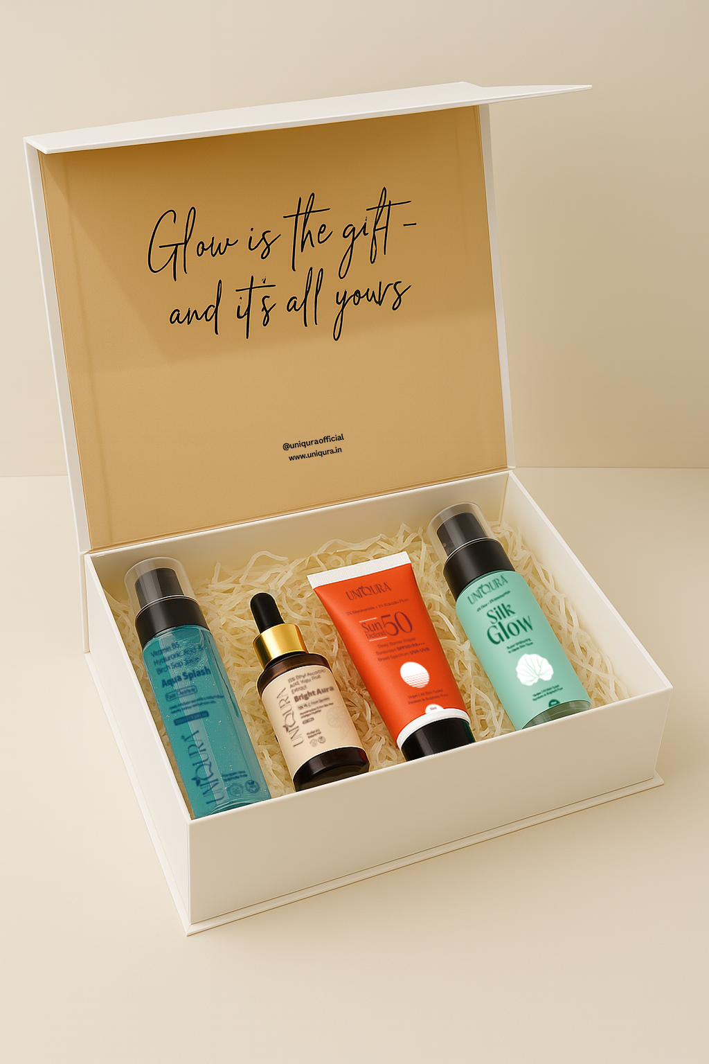 Face Cleanser (100ml) + Toner (100ml)+ Sunscreen SPF50 (50ml) + 15% Vitamin C Serum (30ml) + Gift box