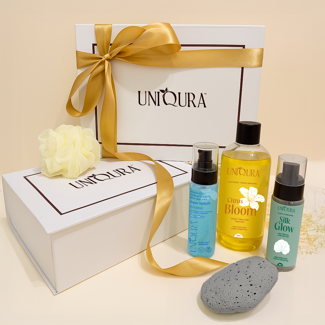 Body wash (300ml)+Face Cleanser (100ml)+ Toner (100ml)+ Loofah + Pumice Stone + Gift box
